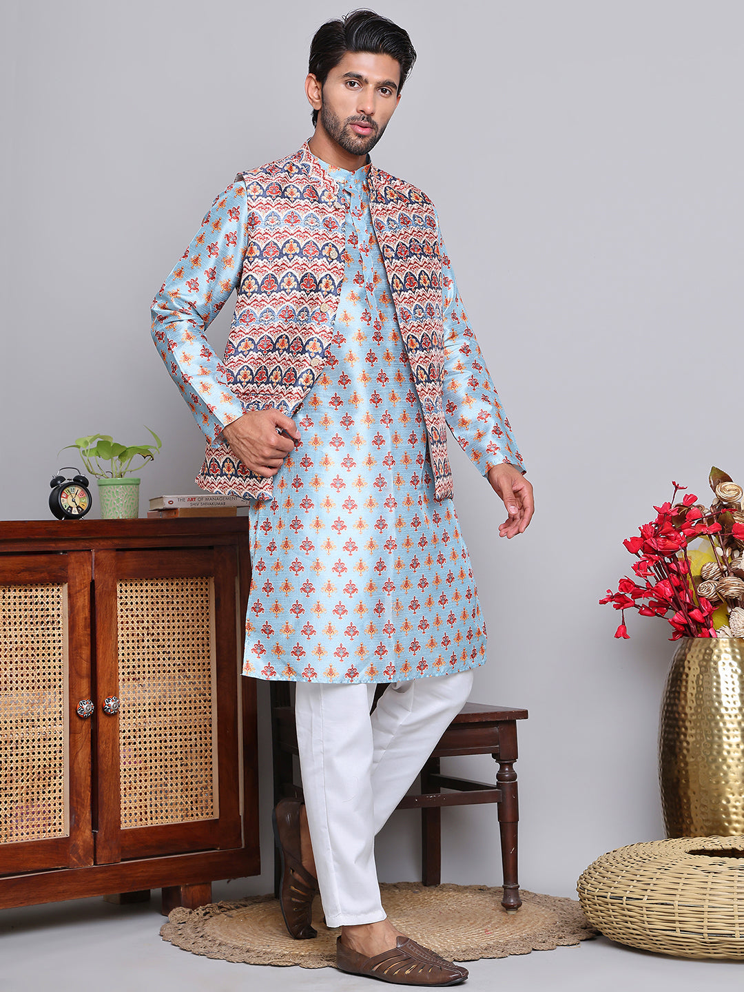 Printed Silk Blend Kurta With Matching Printed Waistcoat Set