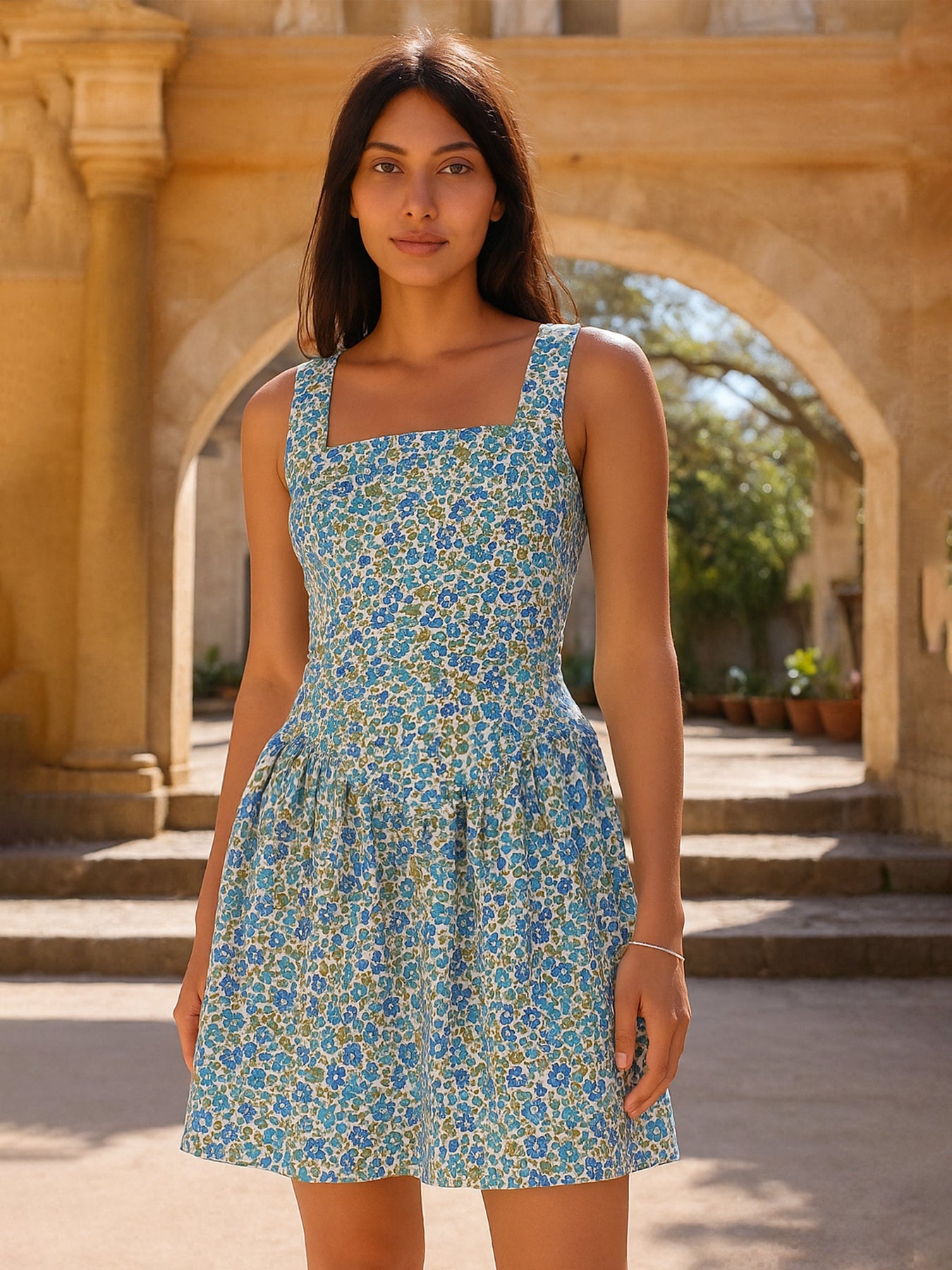 Poplin Ditsy Floral Smocked Back Dress, in Cotton Poplin fabric, Cotton Voile, Above Knee, Fit & Flare, No Closure, Flared Hemline and features Smocking Detail At Back